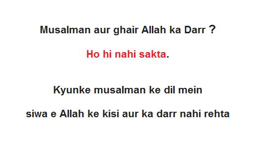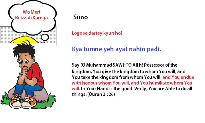 Dar aur khauf insaan ko kisi na kisi ka mohtaaj bana deta hai. Isliye behtar hai ke aap apne dil mein is baat ko jamalen ke, agar allah kisi ko izzat dene chahe to isko zaleel karne wala koi nahi aur aise hi agar allah kisi ko zaleel karna chahe to isko izzat dene wala koi nahi. Izzat, zillat sab allah ke haath mein hai.