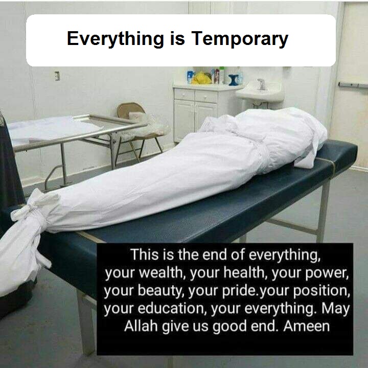 Death is the end of everything, your wealth, your health, your power, your beauty, yor pride, your position, your education, your everything. may Allah SWT give us good end. Ameen ya rabbul alameen.